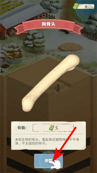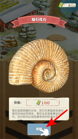 1、挖掘出物品后,依照红色箭头指引,点击捐赠按钮,将物品捐赠以获取对应的货币奖励如5个道具,积累资源。