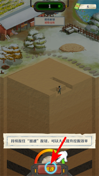 2、回到挖掘界面后,紧跟红色箭头指引,持续按住加速按钮,提升挖掘效率,更快获取地下的物品或资源。