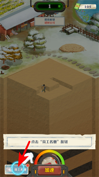 4、资源积累到一定程度后,依照红色箭头指引,点击员工名册按钮,解锁或管理挖掘员工,提升团队的挖掘能力。