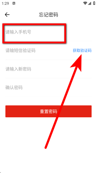 4、在忘记密码页面,输入手机号,点击获取验证码。