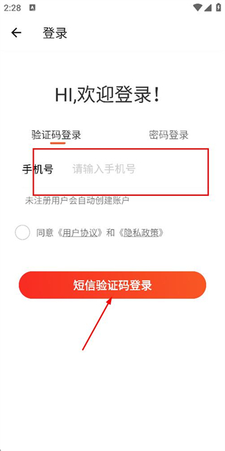 3、在登录页面填写手机号,勾选协议后,点击短信验证码登录。