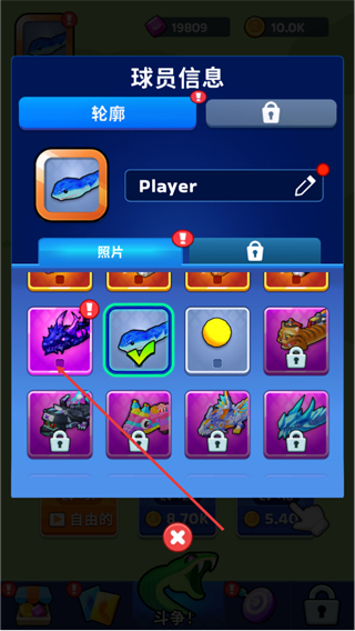 4、进入球员信息界面,可在照片标签下切换角色皮肤,完成操作后点击下方红色按钮关闭该界面。
