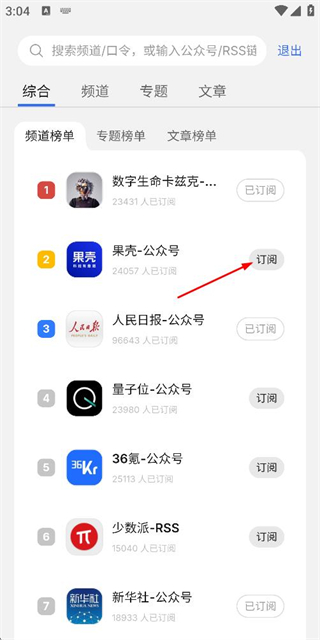 3、在搜索结果页面点击目标账号旁的订阅按钮,完成该账号的订阅。