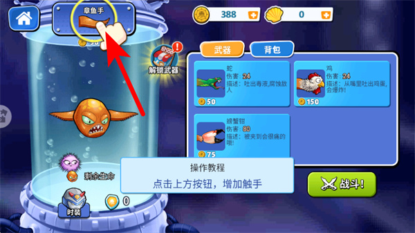 1、进入养成界面后,依照红色箭头指引,点击上方的章鱼手按钮消耗资源,为怪物增加触手,提升能力。