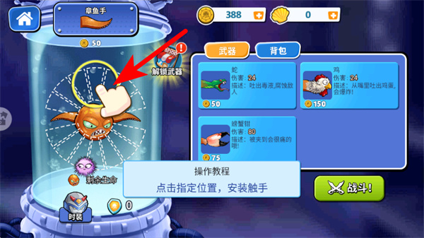 初始拥有两只触手,可通过金币升级解锁更多触手,更换龙虾钳、蛇、鸡等不同属性触手,每种触手攻击特点各异,合理搭配提升胜算。