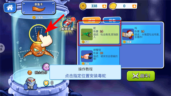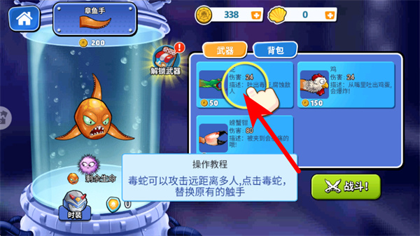 3、需要更换部件时,依照红色箭头指引,点击武器栏中的毒蛇,消耗资源替换原有的触手,提升远程能力。