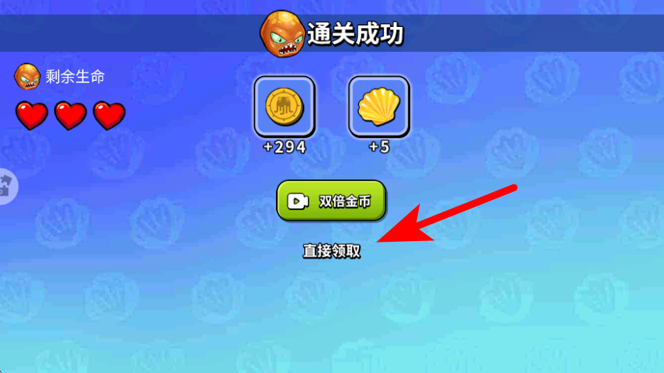 4、通关后,依照红色箭头指引,点击直接领取按钮获取通关奖励,用于后续怪物养成与部件强化。