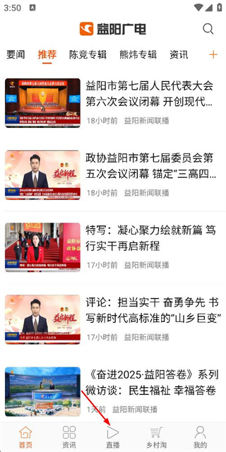 1、在益阳广电首页点击底部的直播选项,进入直播页面。