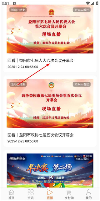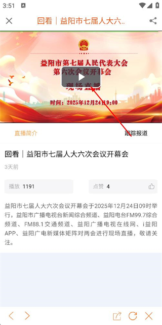 2、在直播页面点击目标直播的回看条目,进入该直播的回看页面。