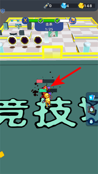 4、持续推进中,依照红色箭头指引,拾取场景中的宝箱获取额外资源,同时继续攻击敌人,完成25次击杀关卡目标。
