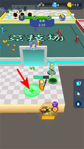 1、进入竞技场后,依照红色箭头指引,优先攻击残血敌人如血量较低的敌方单位,快速完成击杀,提升击杀效率。