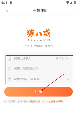 3、填写手机号、短信验证码、设置密码,勾选协议后,点击注册。