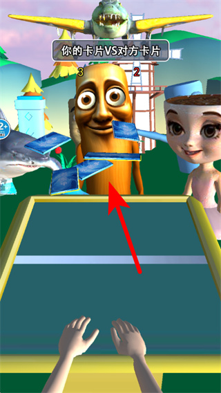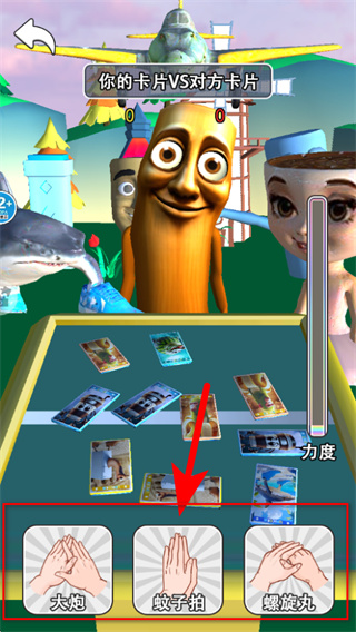 2、对战时,紧跟红色箭头指引,选择下方的技能如蚊子拍,搭配卡牌发起攻击,与敌方卡牌进行对抗。