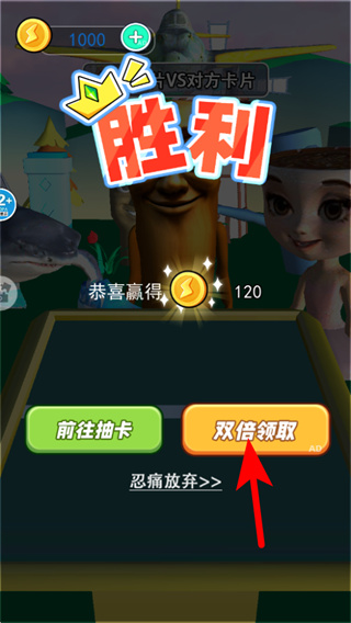 4、胜利后,依照红色箭头指引,点击双倍领取按钮获取更多金币奖励,积累资源用于后续抽卡强化。