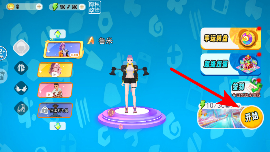 1、在初始界面,点击带箭头指向的开始按钮,即可进入游戏关卡,进入前需确认当前体力如界面显示的10/30充足。