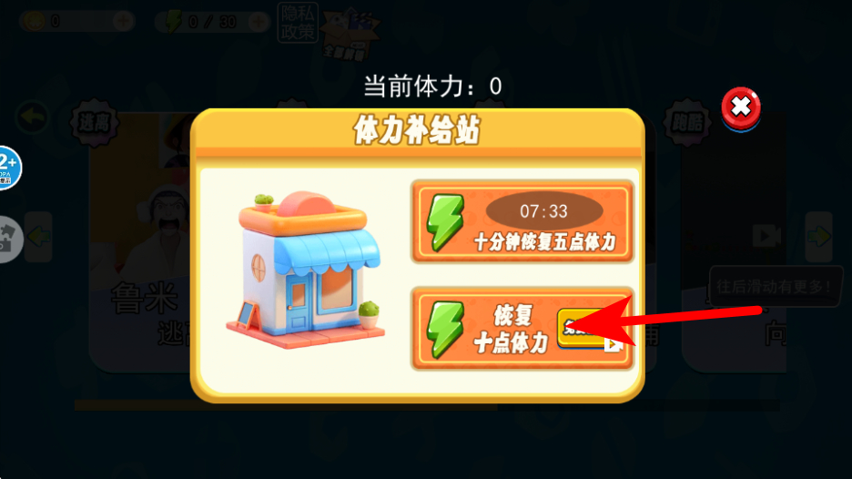 4、当体力耗尽时,在体力补给站点击恢复十点体力按钮,可快速补充体力继续游戏,也可等待自动恢复。