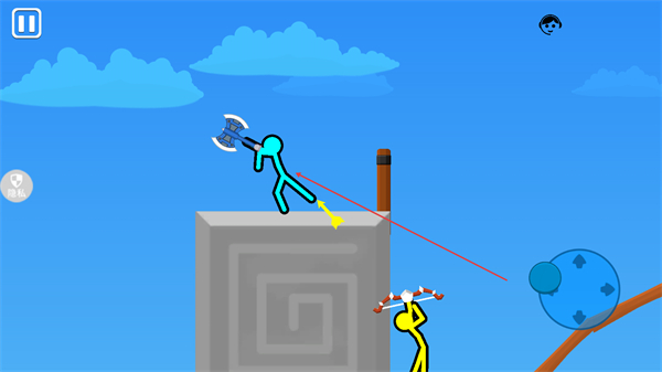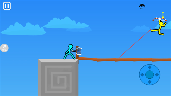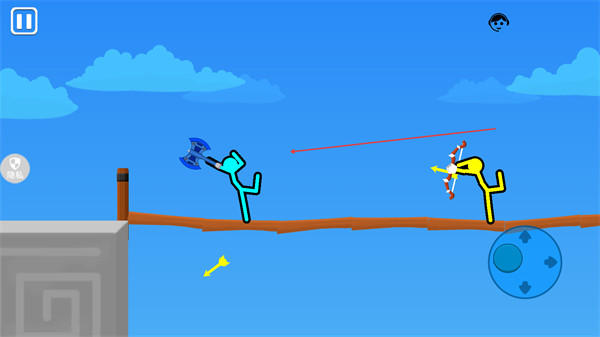 1、操控蓝色火柴人持斧,与黄色火柴人持弓在木板对战,躲避攻击并发起进攻。