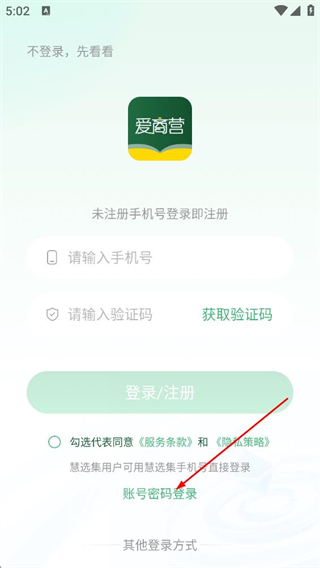 3、在登录页,点击账号密码登录选项,可切换登录方式。