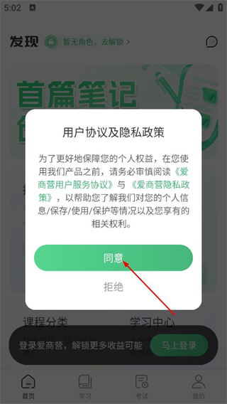 1、在阅读用户服务协议和隐私政策后,点击同意。
