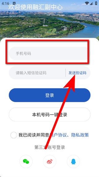 3、在登录页面,输入手机号码,点击发送验证码。