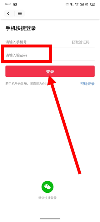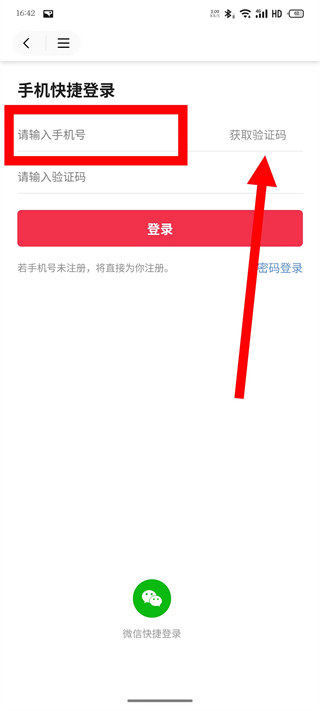 3、在手机快捷登录页面,输入手机号,点击获取验证码。
