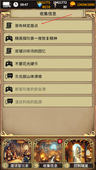 2、进入信息界面后,可获取哥布林定居点等线索,这些信息是解锁新任务的前置条件。