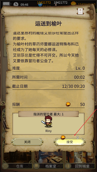 4、点击任务进入详情页,选定已雇佣的冒险者,点击接受即可派遣其执行任务。
