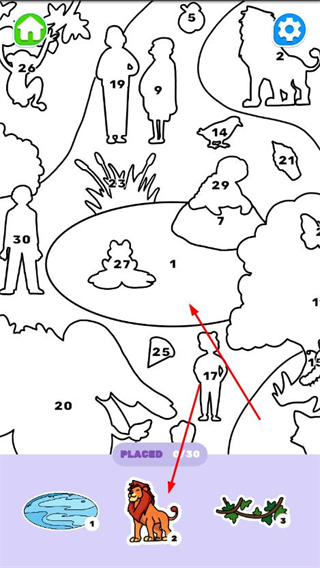 4、在装饰关卡中,将底部的贴纸拖动到对应编号的区域,完成场景装饰。