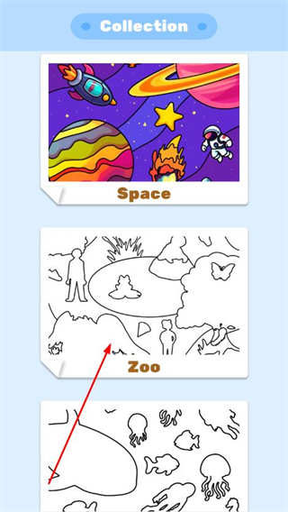 完成一个主题场景后,会解锁对应的彩色成品图,像收集画册一样积累不同主题的作品,既可以回顾创作成果,也能体验集齐全主题的成就感。
