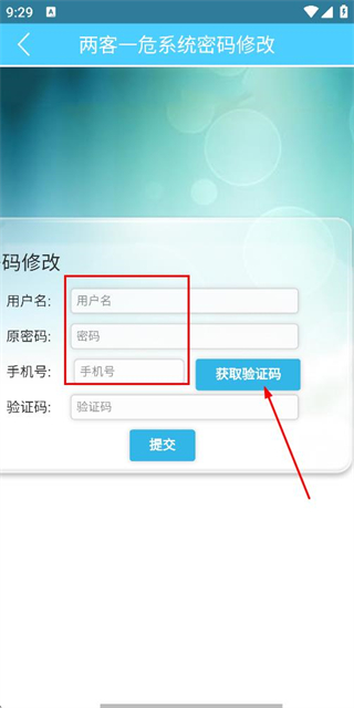 2、在密码修改页面填写用户名、原密码、手机号后,点击获取验证码按钮。