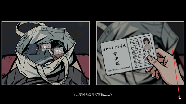 4、在袋内物品中,找到被提示的物品,点击后可查看详情,该物品是学生证同时会出现剧情文字,助力了解游戏背景。