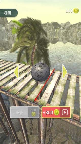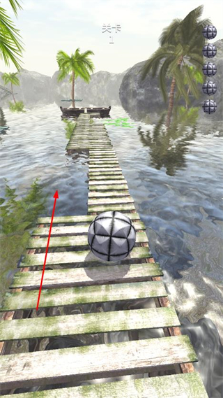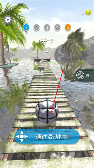 1、进入关卡界面,通过滑动屏幕控制球体移动方向,借助栈道的物理惯性让球体前进。