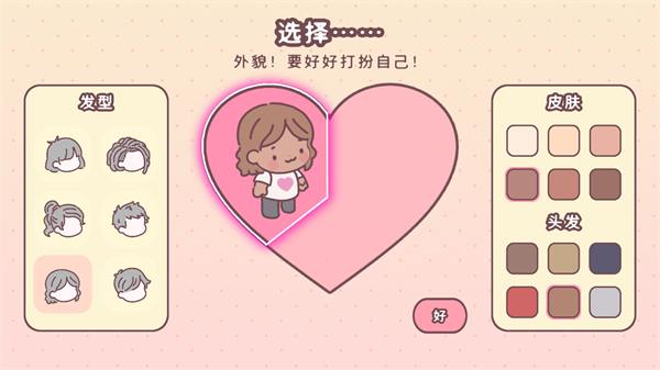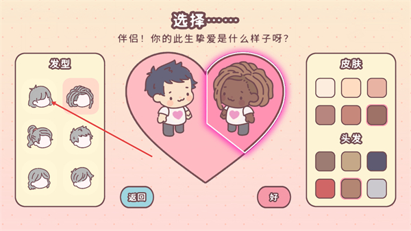1、在该伴侣自定义界面中,可选择发型里的样式,搭配右侧皮肤、头发的颜色选项,设置完成后点击好即可确认形象。