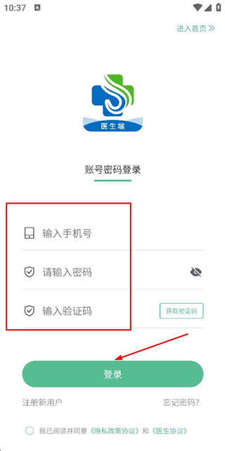 3、在登录页面填写手机号、密码和验证码,勾选协议后,点击登录完成账号登录操作。