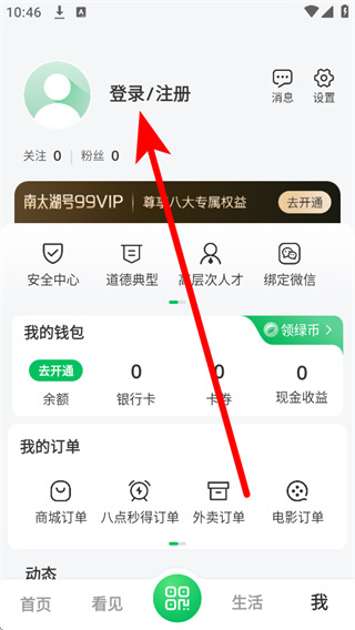 2、在个人中心页面点击登录注册区域,进入南太湖号的登录操作界面。