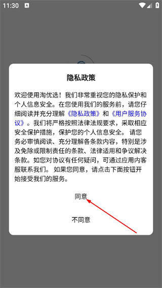 1、阅读隐私政策和用户服务协议后,点击弹窗中的同意按钮。