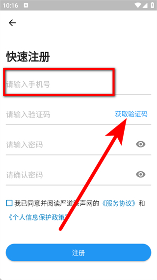 4、在快速注册页面,输入手机号,点击获取验证码。