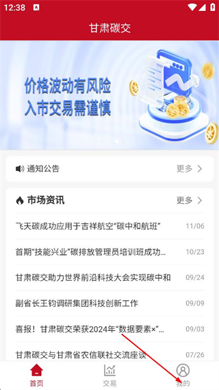 1、在甘肃碳交首页,点击底部的我的选项,进入登录页面。