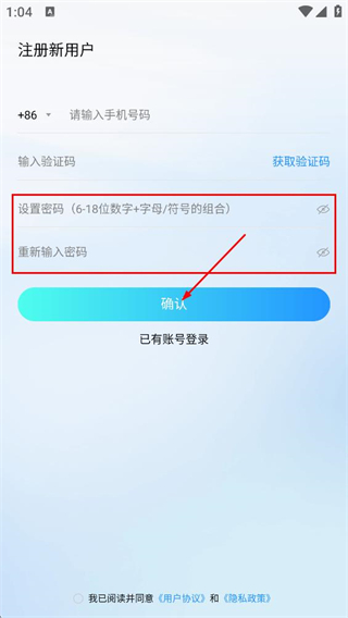 5、在注册新用户页面,填写密码及重新输入密码,点击确认,完成账号操作。