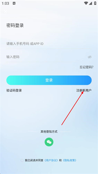 3、在登录页面,点击注册新用户选项,进入注册新用户页面。