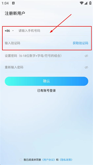 4、在注册新用户页面,填写手机号码,获取验证码后填写验证码。