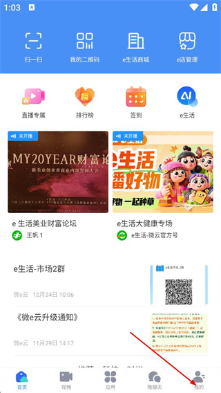 1、在微e云首页,点击底部的我的选项,进入个人页面。