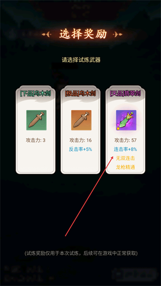 2、战斗后进入选择奖励界面,挑选高属性试炼武器如攻击力57的枪,增强战力。
