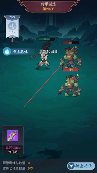 3、进入传承试炼第2/5关,用选得的武器对战树妖,在第10回合持续输出。