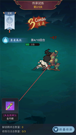 4、第4/10回合触发3连击,对树妖造成-67伤害,借助武器效果推进战斗进程。