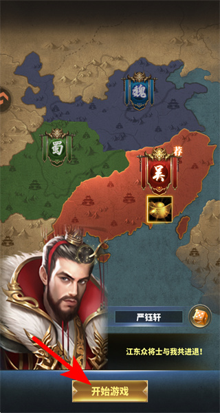 1、在游戏启动界面,点击开始游戏按钮,即可进入三国题材的策略主场景,开启势力发展流程。