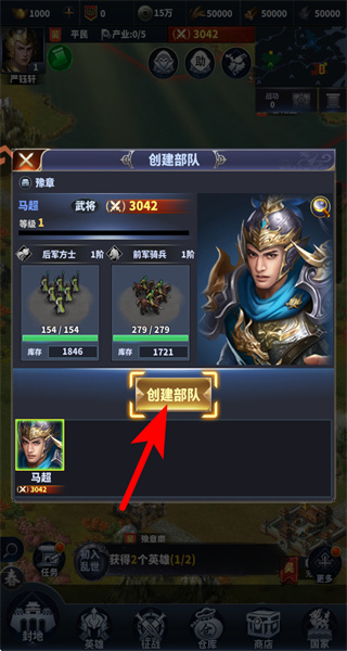 3、在创建部队界面,选择武将如马超及对应的兵种后,点击创建部队按钮,组建初始作战部队。