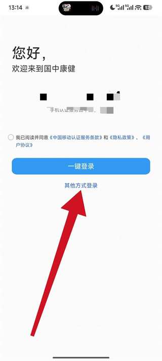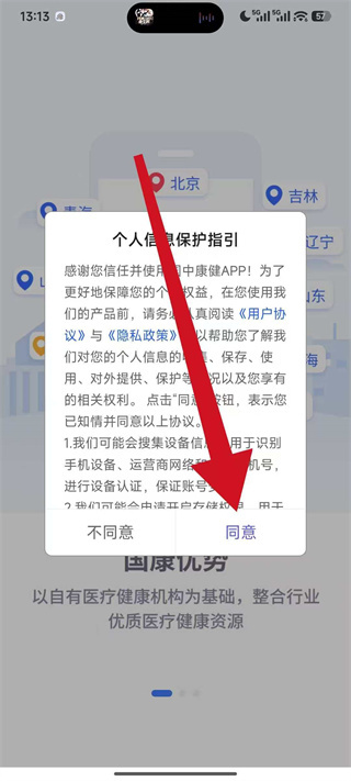 1、打开国中康健,在弹窗中点击同意,进入登录操作界面。