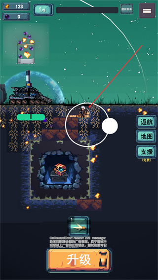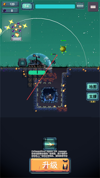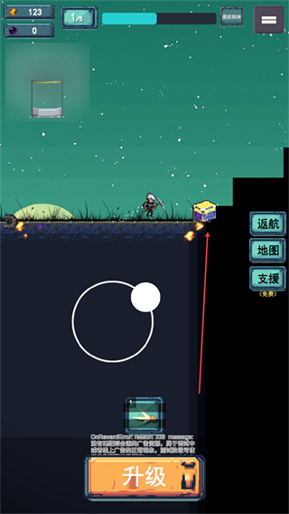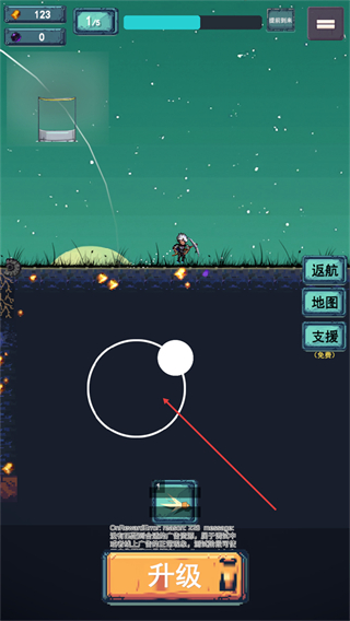 1、操控角色在场景移动,点击“升级”提升战力,躲避攻击,推进关卡探索。