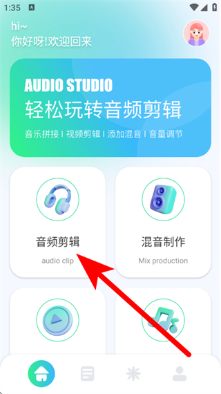 1、在小橘音乐的首页,点击音频剪辑选项,进入选择音频页面。